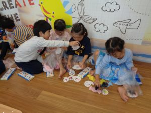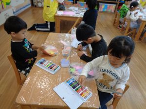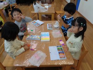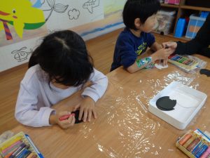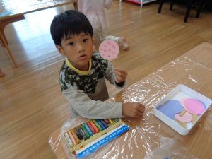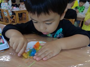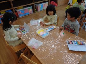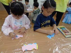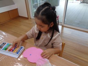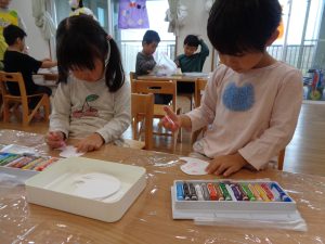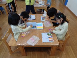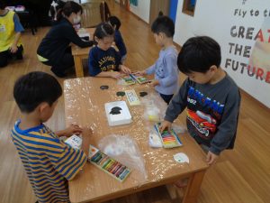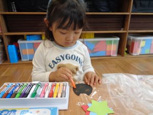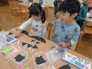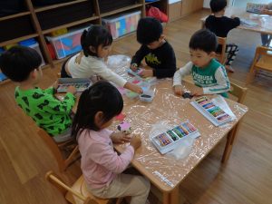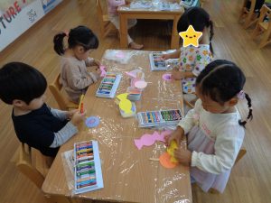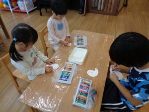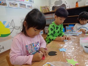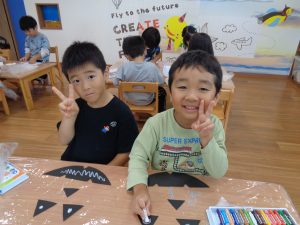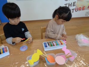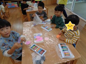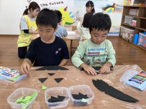この後、子ども達はお部屋に戻り作ったものを貼り付ける作業をしました(^▽^)/