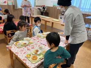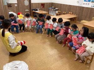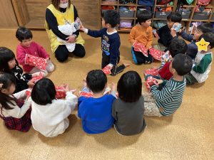 各クラスの代表の子ども達から緊張しながらもプレゼントを受け取っていました(*^▽^*)🎁🎁🎁